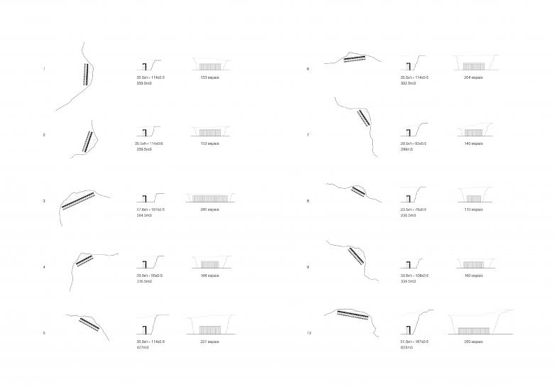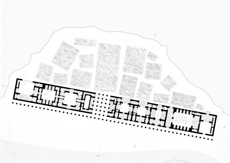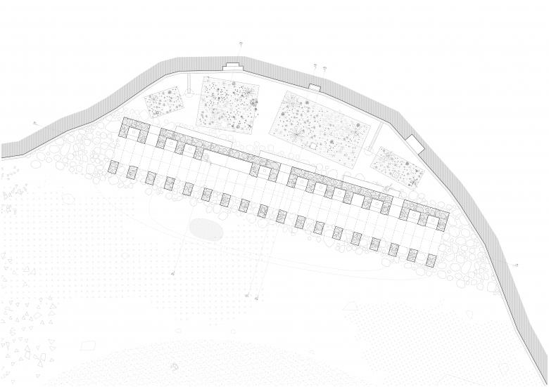 The implantation strategy focuses on occupying the terrace’s concave areas, enclosing them to establish a clear front and back: the built environment in front, a contemplative garden behind. The crematorium, placed in the most accessible flat area, consists of a cluster of spaces oriented towards the deceased, organized into served and servant spaces.