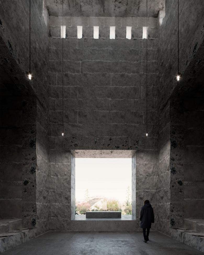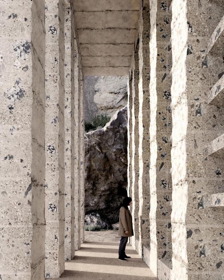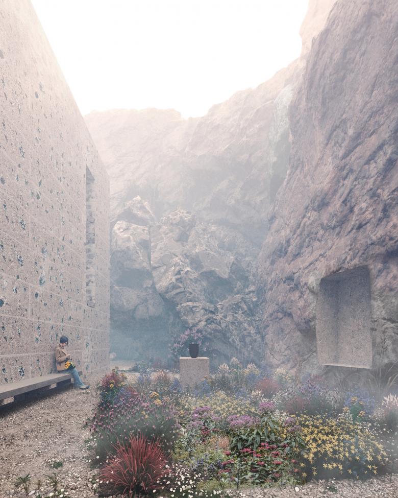 The architecture interacts with the quarry’s rugged stone walls, creating a contrast between regular and irregular forms. Gardens flourish behind the buildings, reinforcing the dialogue between life, death, and renewal.