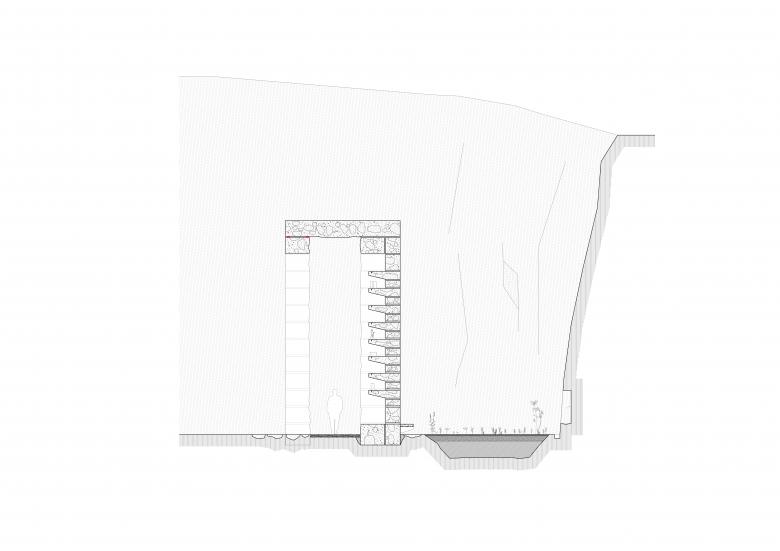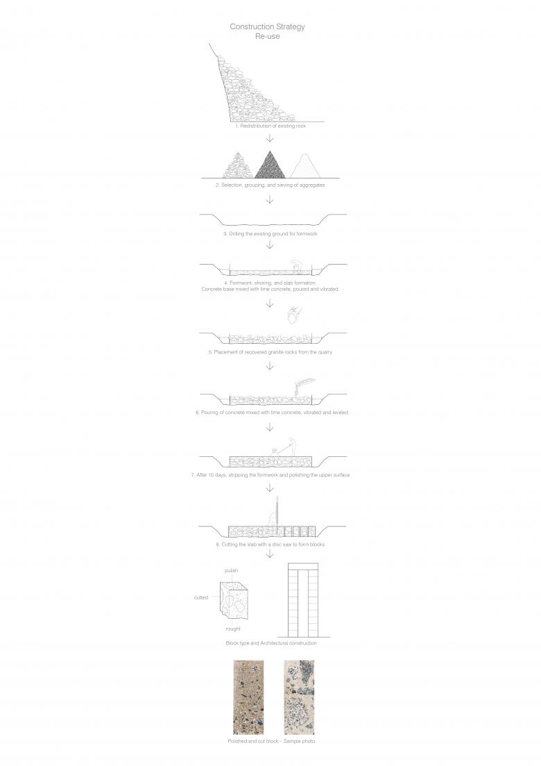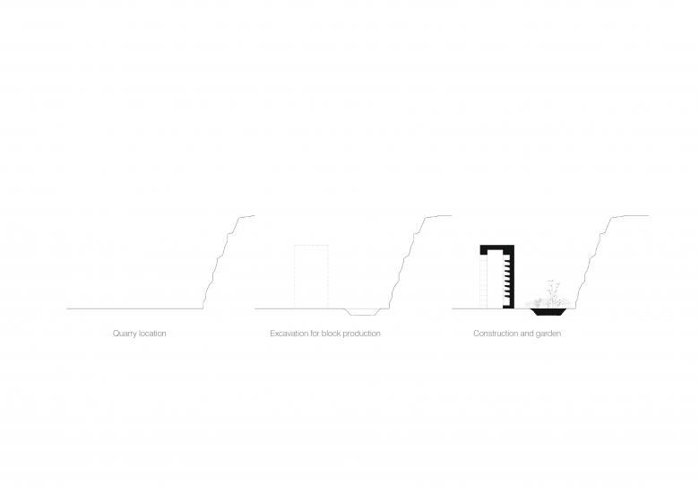 A key aspect is material reuse. The quarry contains scattered granite stones of various sizes, predominantly large ones. These are repurposed into massive blocks that act as architectural elements, working through compression. Large excavated cavities serve as lost formwork for casting, later becoming fertile ground for gardens and integrating nature into the memorial space.