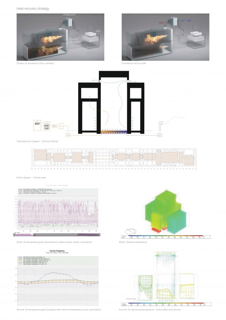 Heat recovery is integrated into the design. Residual heat from cremation is harnessed to acclimatise the building via an underground air circulation system, reminiscent of ancient hypocausts. The massive stone blocks provide thermal inertia, storing and gradually releasing energy. Additionally, the section geometry and the Venturi effect optimize heat distribution.