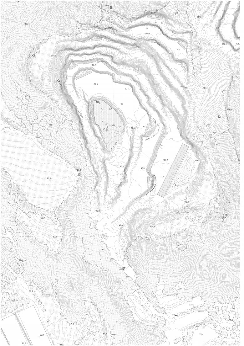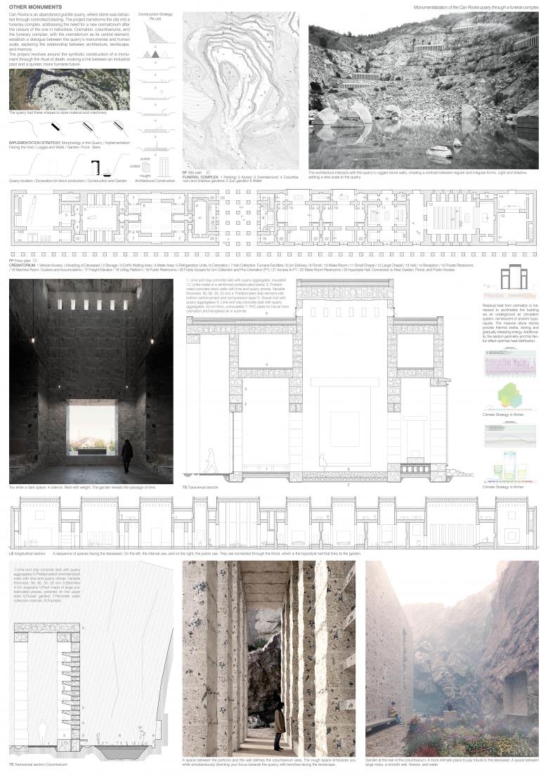 Can Rovira is an abandoned granite quarry, where stone was extracted through controlled blasting. The project transforms the site into a funerary complex, addressing the need for a new crematorium after the closure of the one in Vallvidrera. Cremation, columbariums, and the funerary complex, with the crematorium as its central element, establish a dialogue between the quarry’s monumental and human scale, exploring the relationship between architecture, landscape, and memory.