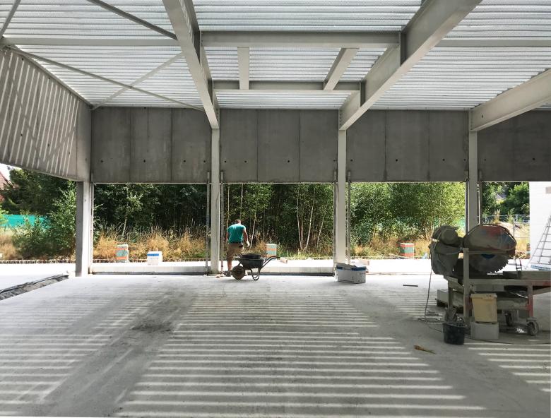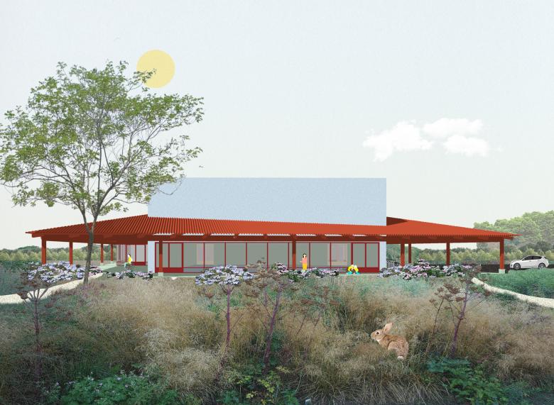From a far, the pavilion is easily recognizable by the red canopy that wraps itself all the way around the main volume. It has its own distinct identity within the existing school grounds without being intrusive. It is a welcome guest, presenting a kind gesture to both landscape and users. The canopy, whilst scaling down the tallest spaces, allows the children to autonomously engage in covered, outdoor activities that were otherwise impossible.