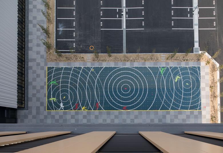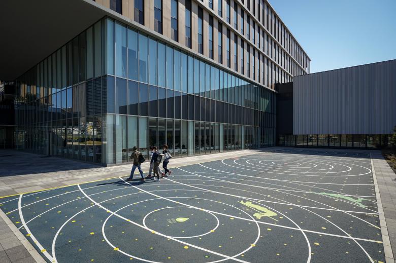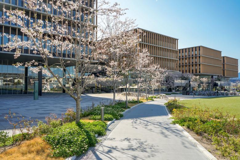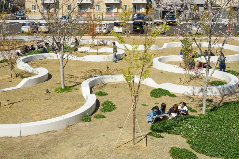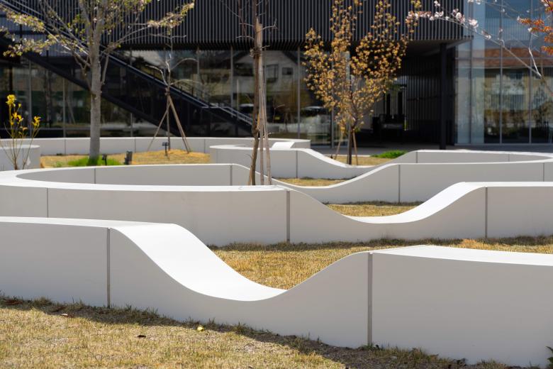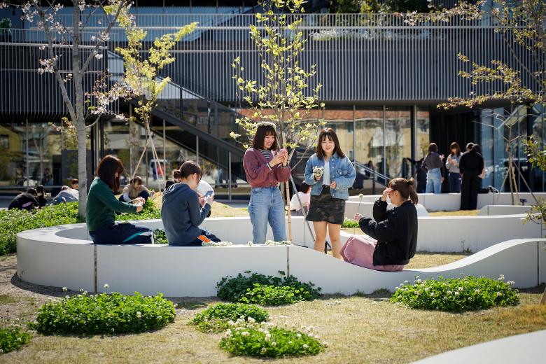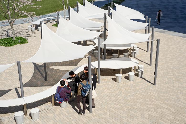For the Tokoha University landscaping project, we planned four terraces for the main locations. In order to link the way the inside and outside of the buildings are used, we set on a theme for each terrace based on a facility within the university. We also designed furniture to match these four themes of "nurture," "eat," "move," and "know." For example, the "eat" terrace adjacent to the food hall is an area where students can converse with each other while eating the food they have purchased from the food hall, while the "know" terrace next to the library features single seats where students can read books they have borrowed from the library or study and think by themselves. In the same vein, the "nurture" terrace that faces the department of education features long single benches that can be used for outdoor lectures, while the outlines of major sports' courts and pitches are represented on the surface of "move" terrace by the sports hall so that it can be used for various sporting activities. In this way, we aimed to create environments in which students can communicate with each other and enrich their lives, whether it be by just talking casually with friends, by taking part in group activities, or by attending talks and seminars.