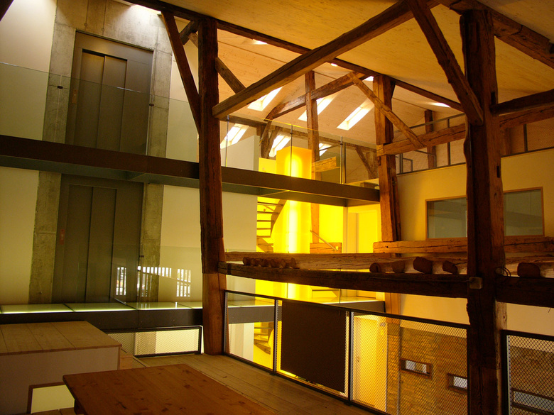 Mit 4 Erschliessungstypen, die sich überlagern, wurden all diese Bereiche erschlossen. Die Schräge der Tenndurchfahrt als sanfte Rampe, die Verbindungsgalerien als horizontale Brücken, der Lift als vertikales Stabvolumen und die Treppe als gewendelte Figur.