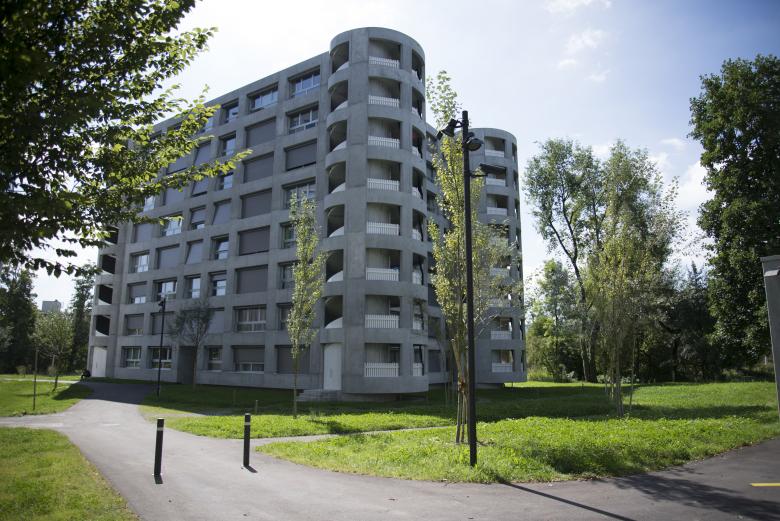 Zwischen dem mächtigen Rohn-Bau und einem der naturnahen Weiher liegt ein Wohnturm von Herzog & de Meuron Architekten. Die in die Blumenwiese eingestreuten Silberpappeln werden den imposanten Bau mit den Jahren noch näher mit der Natur verwachsen lassen.