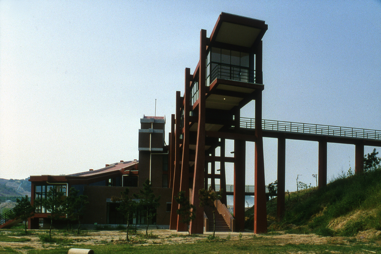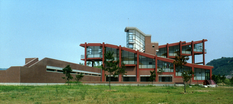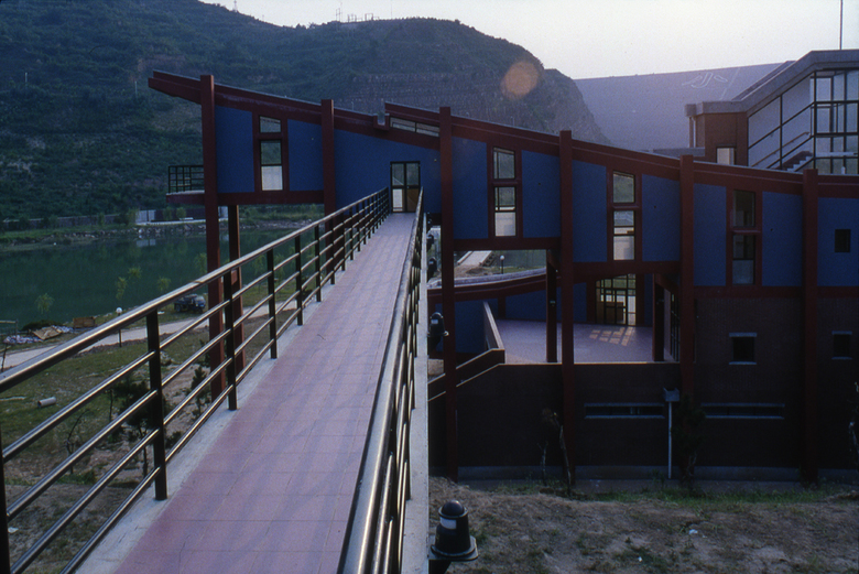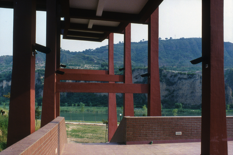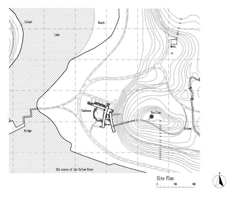 黄河经过河南洛阳附近的小浪底大坝后,从原河道北面与之平行的新辟水道泻出。大坝 脚下的一段原河道除了为水坝排泄正常渗水外,其周围52.6公顷的区域被开发为公园。按照上海市园林设计院周在春先生的规划,部分河道被拓宽为湖面,并在 湖与原河道相交处安排了一座茶室。从该处西望正对大坝及其脚下的湖中岛屿。向北是供游泳者使用的湖滨沙滩。东面为高十多米的小山丘,山后为顺一道溪流建造 的黄河各水利工程模型。沿基地南面全长则是原来的黄河。我有幸受周先生邀请与园林院同仁提供了茶室的设计。在甲方代表陈玲女士的认真监督下,本工程在 2002年秋基本按设计建成。