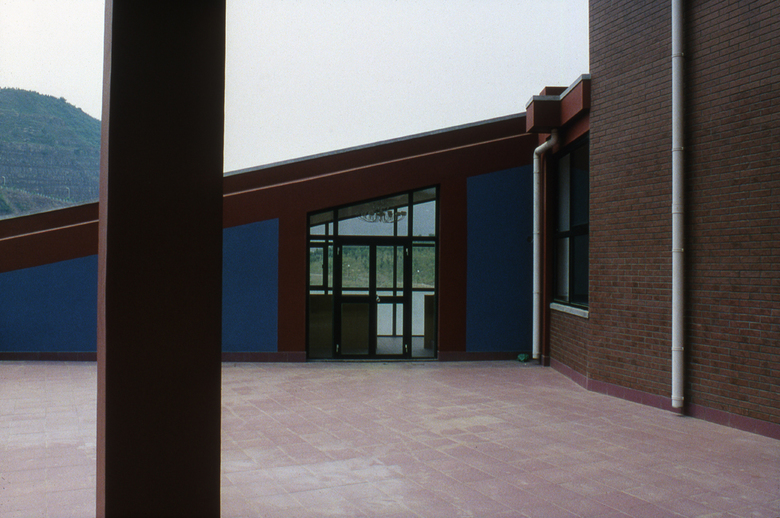 两个曲线体块的建筑形式为露明的钢筋混凝土梁柱,朝大坝一面的填充墙全部为透明或磨砂玻璃。柱身设在玻璃面的外面,期望能对西晒起一定遮阳作用。另两个体块外形则采用贴面砖的实墙,辅以铝窗。