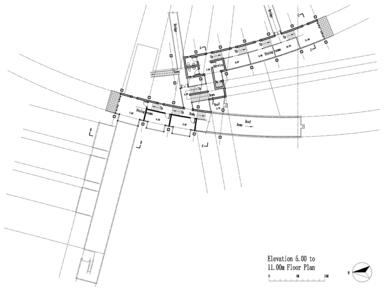 该茶室由四个条型体块组成。其中两个在立面上呈曲线升起的体块构成茶室的主体,内含11个楼面标高从 1.00米依次递增到11.00米的餐厅。每个餐厅可坐8-10人,全部面对大坝及湖景,但高度的变化使各个餐厅的景观从以湖中曲桥,小山为主过渡到以雄 伟的大坝为中心。除了北端的三个外,所有餐厅均仅用矮墙分隔,从而在室内形成一个连续的台阶型空间。在此“大台阶”的标高5.00米及10.00处各有一道天桥延伸到建筑背后的小山山腰及山顶上,从下面上来的游人可由此继续游览山后的其它景观(对从山后过来的游人则可探索湖景)。