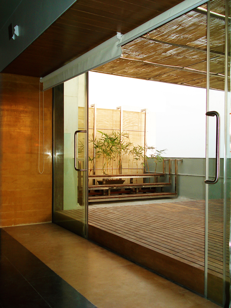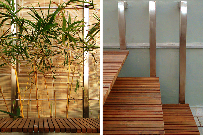The choice of Stainless Steel, Wooden slats and Bamboo chicks as the core architectural elements became obvious as we set out a brief to have a terrace garden that takes less time to maintain and gives more time to entertain self and others. The amalgamation of these urbane and rustic materials create a space that filters the sunlight through porous Roof; provides privacy through Screens; frames scenic vistas of the glistening river, open fields and sprawling city through raised Deck; and ensures healthy growth of plants through elevated Racks for the pots. All this while one sits down and takes in the fresh breeze from Arabian Sea and River Tapi.