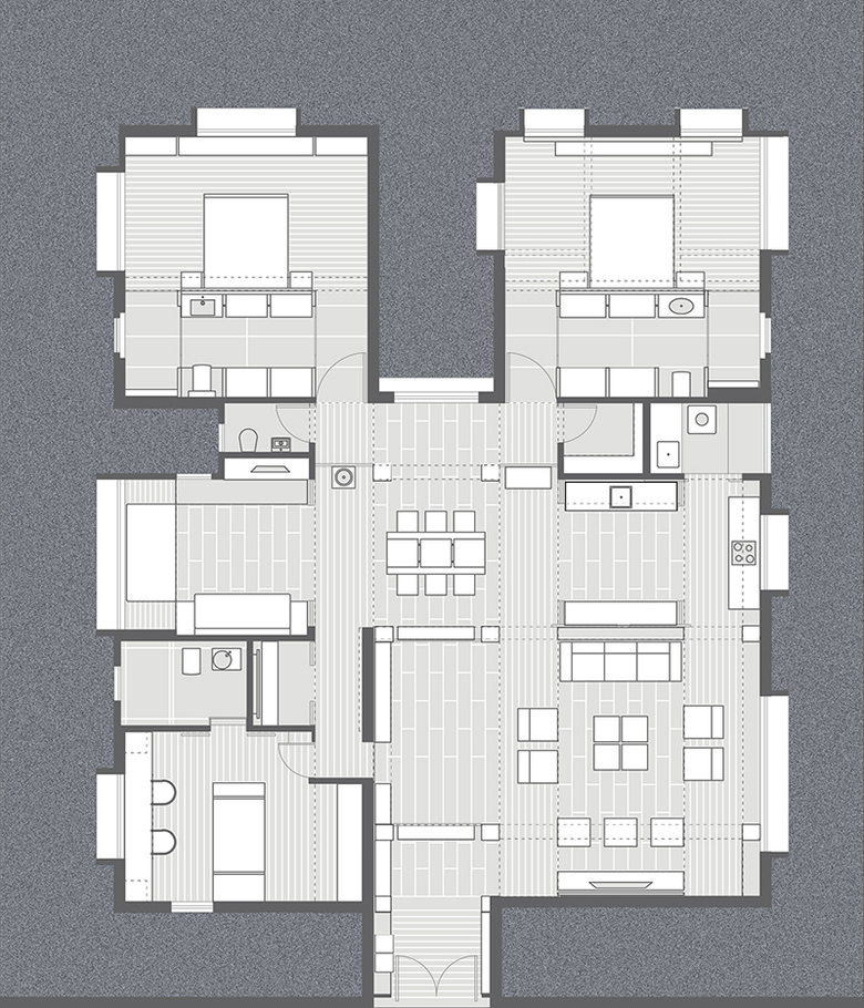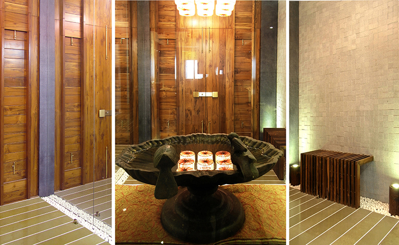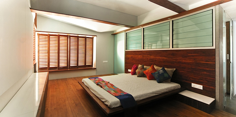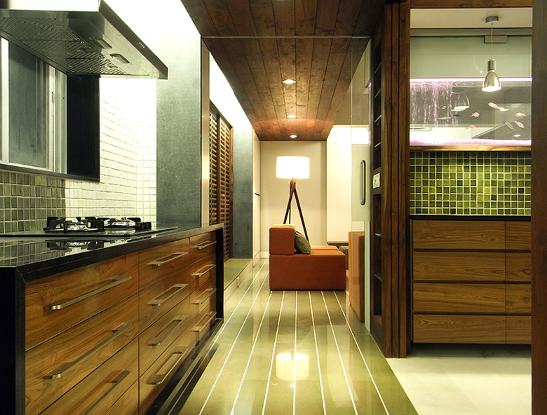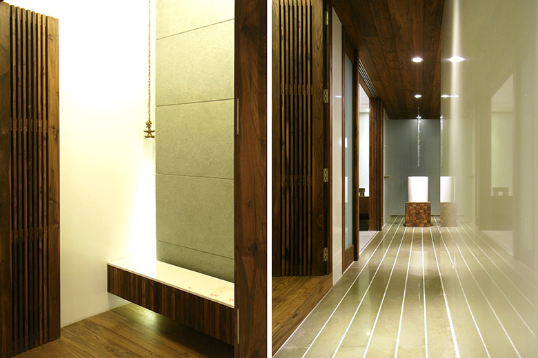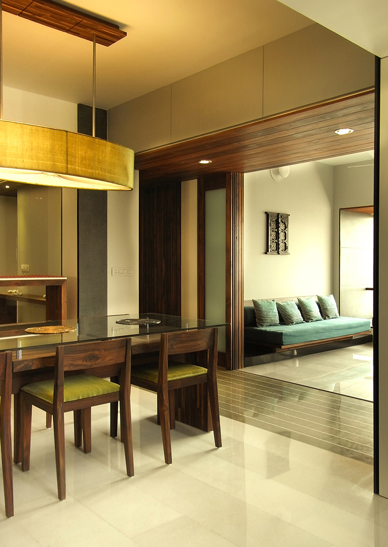 All four sides of the apartment facing onto vast open spaces providing views of the city skyline were exploited by locating the dining space at the center. This brings all the people and spaces of the house together to enjoy the sunrise and the sunset at breakfasts and suppers. The other spaces are tucked away along the periphery, guarded by layers of frosted glass and sliding slatted wooden screens that filter the gentle glow and breeze, ideal for sunny humid nature of the coastal climate. The wood planks and stone slabs of earthen textures and muted colour tones define the space; while furniture and lamps with soft cotton and silk furnishings in bright tones along with a few artefacts occupy these spaces as objects that mellow down the apparent grid structure.