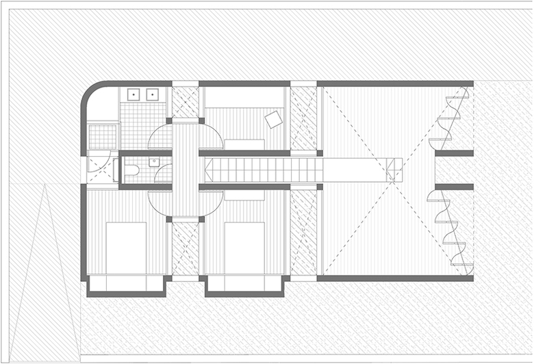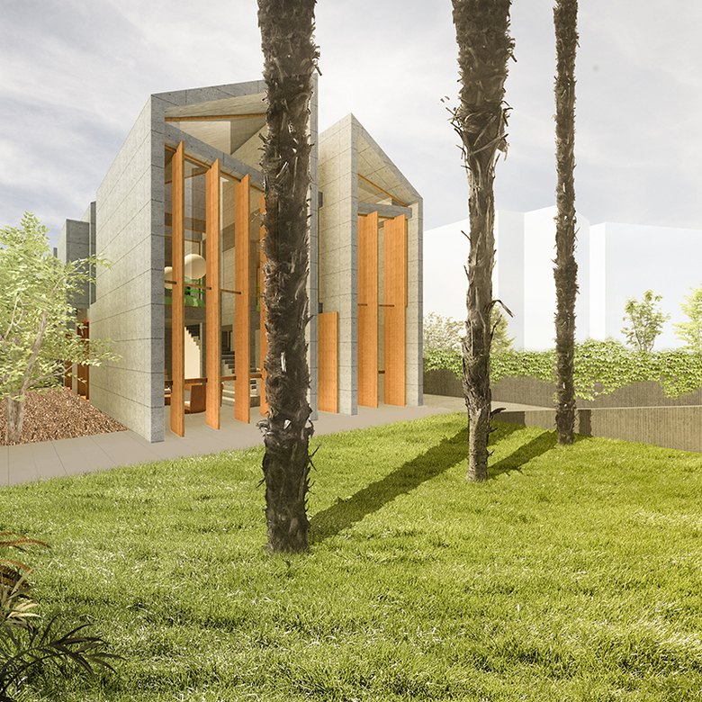 A proposal with an inherent paradox, a small weekend house  for a large family on a small piece of land prompted us to look at the existing rural typology. The contrast in the brief lead us to develop the house as a small barn house, prevalent in the backyards of the large main houses in that region; leaving  open yard in front.  The ground floor with small footprint expands in volume to merge with the yard in front  through tall doors along its length. The yard is planted with coconut trees at close distance, which can grow tall to form a large seamless canopy  as an extension to the roof of the house and yet leave a lot of space for children to run around its slender trunks and people to laze about in the sunny afternoons. The coconut trees also blend with the surrounding orchards in this seaside village. The upper floors are seen  as  compact pavillions to merely rest and rejuvenate; where the plants, breeze and the light sway by from different sides.