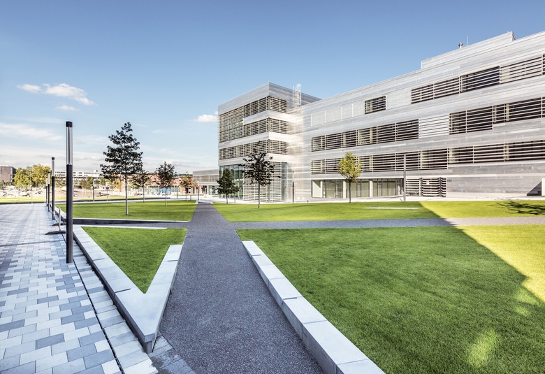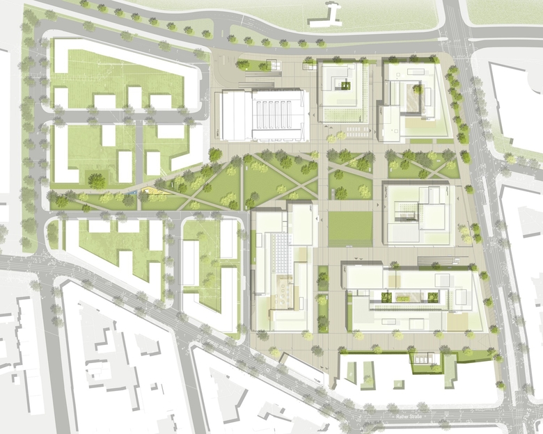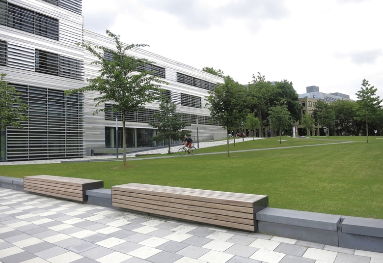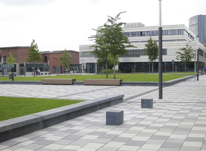 Die Außenanlagen stützen die ruhige und klar gegliederte Raumstruktur des Städtebaus. Zentrum des neuen Quartiers wird der Nord-Süd ausgerichtete Grünzug, der - als bespielbare Rasenfläche - auf den Haupt-Platz zuläuft. Der Platz wird zukünftig Treffpunkt und Veranstaltungsort. Breite Stufen senken sich zu einem tiefer liegenden Parterre hin ab und werden zu Sitzgelegenheiten während Freiluftveranstaltungen. Die Außensitzbereiche der Mensa und des Veranstaltungszentrums finden hier ebenfalls ihren geschützten Bereich und beleben das Geschehen. Gestaltthema des Parks ist die „Verwebung“ der westlichen und östlichen Bebauungen. Wie ein Netz verbinden Wegeverbindungen die Quartiere. Einzelne bepflanzte Wiesenflächen sorgen für blühende Aspekte in den Jahreszeiten.