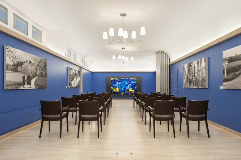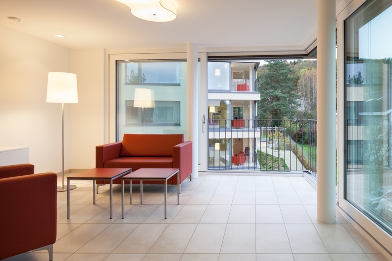 Das 1985 erbaute Alters- und Pflegeheim in Oberwil wurde in den letzten drei Jahren umfassend erneuert und deutlich vergrössert. Verbindendes Element zwischen Neu- und Altbau ist die attraktive Promenade, welche schon beim grosszügig überdachten Haupteingang die Besucher willkommen heisst. Die Promenade greift weit in die Bauten hinein, führt zu den Liftkernen und Servicezonen und bildet zudem durch ihren identitätsstiftenden Charakter eine eindeutige Orientierung im gesamten Erdgeschoss. Durch eine abstrakte Inszenierung von blumenförmigen Deckenleuchten und runden Akustiksegeln wird ein starker Bezug zum erneuerten Seerosenteich im Hof geschaffen. Dieser Hof ist durch die weitläufige rahmenlose Verglasung omnipräsent.
