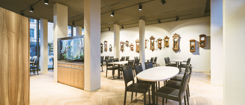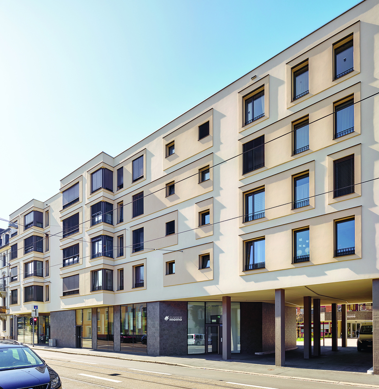 In einem ersten Schritt wurde der Gastronomiebereich mit Restaurant Momo, Küche und Lager vergrössert und komplett modernisiert. Die Fassade des Vorderhauses und des Zwischentrakts erhielt eine Wärmedämmung und einen neuen, zeitgemässen Ausdruck. Mittels Zusammenfassung der Erker und deren Einbindung in die neue Optik der Hauptfassade erhielt das Gebäude eine freundliche und individuelle Note. Eine neue Ebene von Gewändeflächen bindet gruppenweise mehrere Fenster zusammen, vergrössert damit optisch den Fensteranteil und unterstreicht die Horizontale. Der Feinputz wurde in zwei hellen, warmen Farbtönen gestrichen. Die Fenster und Geländer treten in einem warmen, dunklen Ton zurück. Ebenfalls dunkel gehalten wurde der Gebäudesockel, welcher durch einen unregelmässigen Wechsel von offenen Glas und geschlossenen Feinsteinzeugflächen besticht.