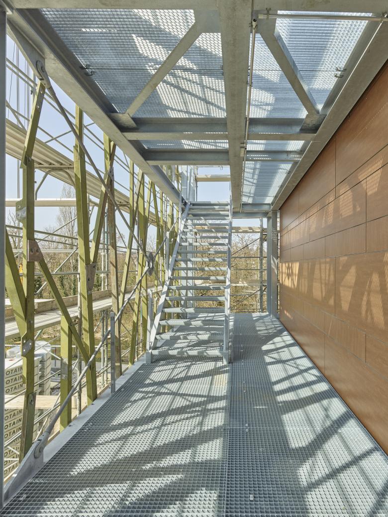 Eine zentrale Rolle spielen die 60 Jahre alten Hochspannungs-Gittermasten, die als Schrottmaterial dem Netzbetreiber Swissgrid abgekauft wurden. Anstatt eingeschmolzen zu werden, ummanteln sie jetzt die Laubengänge, die eine ebenfalls stählerne Gitterstruktur rund um den hölzernen Kubus bilden. Ursprünglich sollten die gebrauchten Masten tragend eingesetzt werden, doch da die außenliegenden Gänge auch als Fluchtweg dienen, ließen die Baubestimmungen dies nicht zu. So bilden die ehemaligen Strommasten jetzt ein Rankgerüst für Kletterpflanzen, was wiederum der Verschattung und damit dem (Raum-)Klima dient. Zudem sind die Laubengänge eine nicht zu beheizende Erschließungszone, sodass das Innenvolumen reduziert werden kann. Innen kehrt das Masten-Motiv an den Brüstungen wieder.