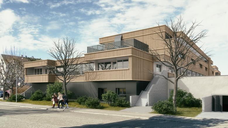 Die typische 70er Jahre-Fassade, materialisiert mit vorgehängten Waschbetonelementen und orangefarbenen Metallflächen, war praktisch unisoliert und sollte einen zeitgemässeren Ausdruck erhalten. Eine Überdämmung der Waschbetonplatten hätte zu unangenehm tiefen Fensterleibungen und geringeren Verglasungsflächen geführt. Die neue Holzfassade erinnert in ihrer Tektonik an das Prinzip der ursprünglichen Elementfassade. Die glatte Holzverkleidung unterstreicht dabei die tragende Funktion der darunterliegenden Ortbetonstütze. Das lamellierte Füllelement erklärt die vorgehängte, nichttragende Funktion. Die edelstahlbedeckten Holzsimse schützen und gliedern die Elemente. Die mit Schlammfarbe lasierte Schweizer Weisstanne ist langlebig und erzeugt ein attraktives Fassadenkleid ohne Vergrauung. Balkon-/Laubengang-Einschnitte und Attika-Rücksprünge schneiden als weisse «Weichteile» in die Volumetrie ein. Damit der Zugangshof heller, und der Blick auf die umliegenden Fassaden frei wird, wurde das Glasdach vom dunklen Gitterrost befreit.