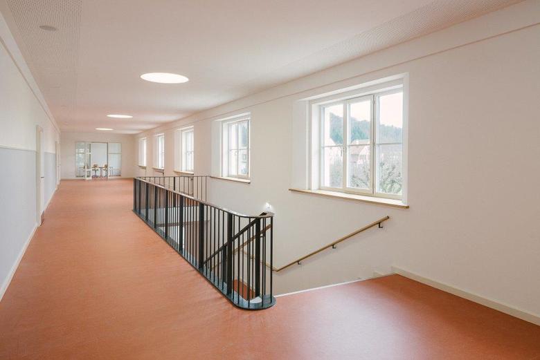 Im Korridor herrschte 1930 ein Klinkerboden vor, welcher aufgrund von Setzungsrissen in den 70er Jahren mit einem Kunststeinboden überzogen wurde. Aufgrund der durch die geologischen Verhältnisse anhaltenden Geländesetzungen wurde auf diesen grossen Flächen auf Plattenboden verzichtet. Der gewählte Linoleum nimmt Bezug zum ursprünglichen Klinkerrot. Die axialsymmetrische Deckengestaltung mit grossen LED-Einbauleuchten vermittelt dem Korridor eine würdevolle Ruhe. Die ursprünglichen Geländer wurden beibehalten, anthrazitfarbig gestrichen der bronzene Handlauf aufpoliert. Die Geländer im Nordflügel wurden bezüglich der Sicherheit mit gebogenen Staketenschlaufen ergänzt.