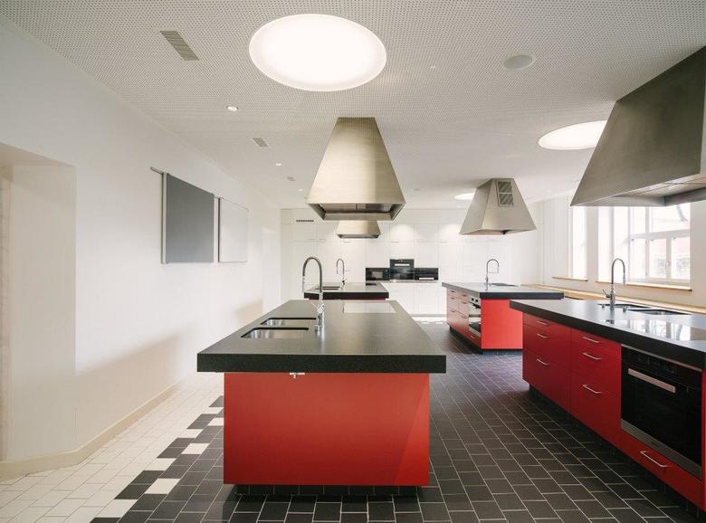 Die bisher nicht vorhandene Schulküche wurde nach den Richtlinien des Kantons mit modernen Kochinseln und Kombinationsschrankfront erstellt. Bewusst in Szene gerückt wurden die Inseln als Hauptarbeitsplätze. Trapezförmig konisch geformte Umlufthauben und das wie ein zentraler Teppich ausgerollte, zweifarbige Bodenmosaik prägen als Analogie zu den 30er Jahren den Raum.