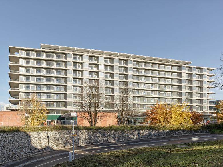 Herzstück des umgenutzten Spitalgebäudes ist das doppelstöckige Foyer. Vom Foyer aus sind die öffentlichen Nutzungen im Parterre über eine innere Gasse erschlossen. In den Obergeschossen finden 130 kompakt geschnittene Wohnungen Platz. Eine kaskadenartige Treppe führt vom Erdgeschoss bis aufs Dach. Sie verbindet die Wohngeschosse und fördert den Austausch unter den Bewohnerinnen und Bewohnern im «vertical village».