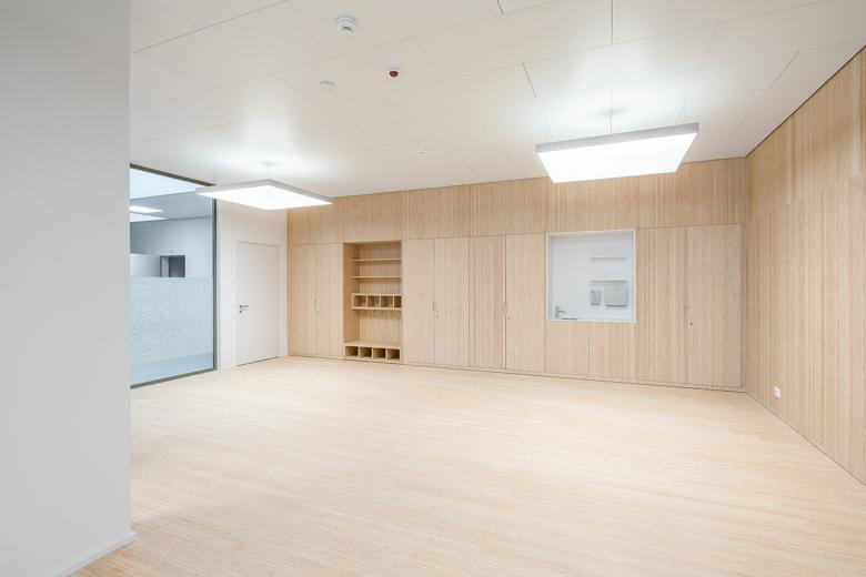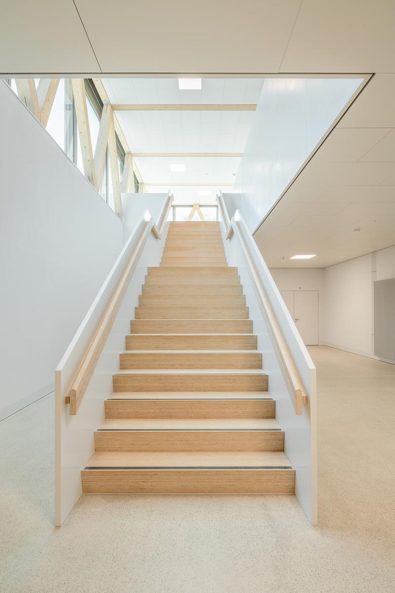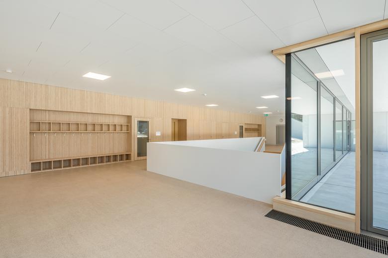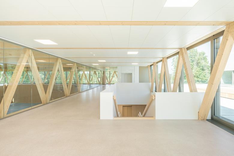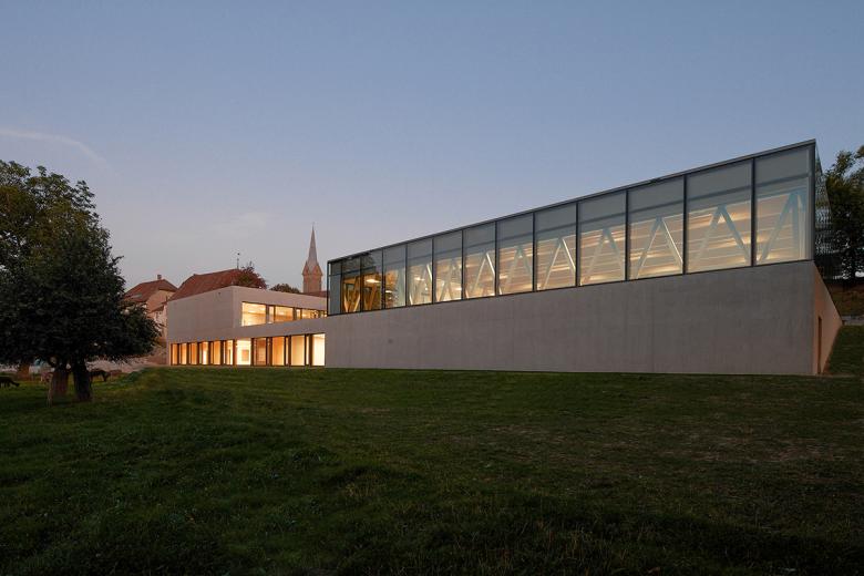 Der Baukörper wird am Rand des kleinen Tals positioniert. Der Landschaftsraum bleibt frei, die Topografie spürbar. Das Gebäude entwickelt sich aus dem Terrain und nimmt sich in der Höhe stark zurück. Dadurch wird die Sicht auf die Silhouette des Schloss- und Kirchenbezirks nicht beeinträchtigt. Das Projekt wird als Pilotprojekt mit der Arbeitsmethode BIM umgesetzt. Das gesamte Planerteam nutzt hierbei die optimierte, integrale Planung mittels eines digitalen Gebäudemodells. In einem zweiten Schritt wurden bis 2022 die denkmalgeschützten Gebäude der Schulanlage saniert.
