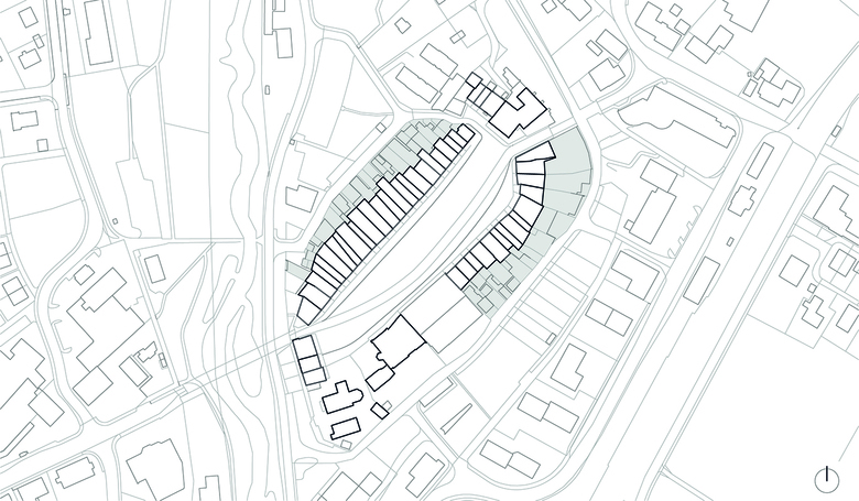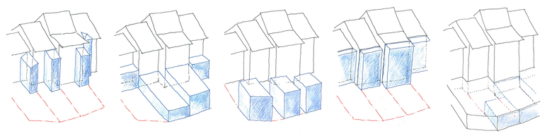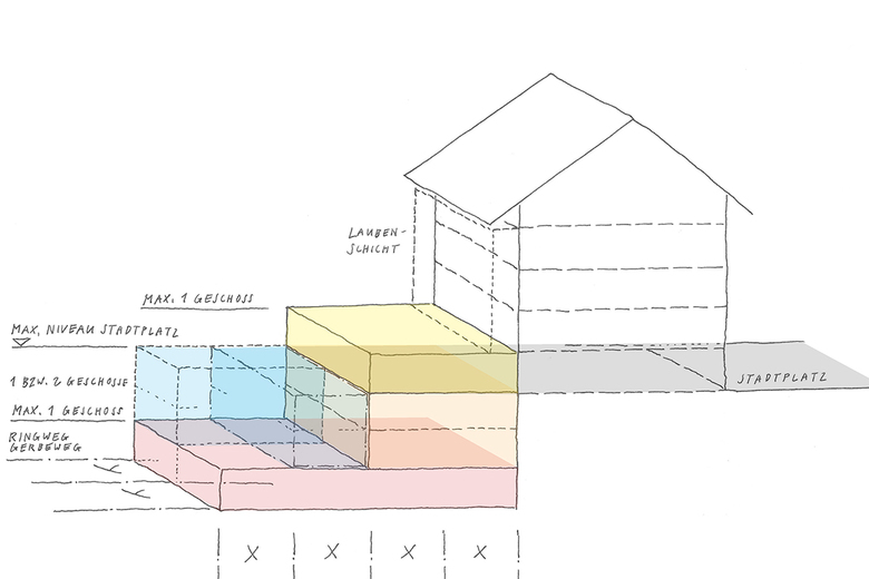 Mittels Unterteilung der Parzellenfläche (Halbierung, Viertelung, Festlegen von Baubereichen) werden „Baufelder“ für die unterschiedlichen Bebauungsmöglichkeiten und Bautypen bestimmt. Für die einzelne Bauherrschaft entsteht so ein «Baukasten», mit dem sie die für ihre Bedürfnisse passenden Möglichkeiten auswählen kann: Hofbebauung oder eine stufige Bebauung, Erweiterung der Ladennutzung im Erdgeschoss, Erweiterung der Räume in den Obergeschossen mit einer offenen Laubenschich