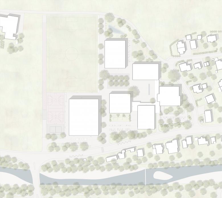 Der Neubau des Kultur- und Sportzentrums wird als kompakter Gebäudekörper südwestlich der bestehenden Schulanlage positioniert. Das Grundmuster der bestehenden orthogonal gerichteten Bebauung wird weitergestrickt und das vorhandene Konglomerat kohärent ergänzt. Die Höhenentwicklung und Fassadenproportionen orientieren sich am Bestand.