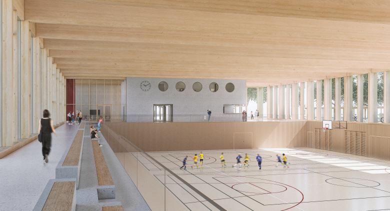 Die Sporthalle mit den Spielfeldern, Geräteraum und Zuschauergalerie kommt über dem Erdgeschoss zu liegen. Das konsequente Stapeln der Nutzungen reduziert den Fussabdruck und verleiht dem Gebäude eine repräsentative Erscheinung mit hohem Wiedererkennungswert. Für das Erdgeschoss wurde eine flexible Raumstruktur entwickelt, die die unterschiedlichen Bedürfnisse von Schulbetrieb, öffentlichen Anlässe und Sportbetrieb erfüllt. Die Materialisierung des Neubaus beschränkt sich auf warmtonigen Beton, Glas und Holz. Der präzise Einsatz der Materialien unterstreicht die einfache, klare Geometrie des Baukörpers. Diese Geste akzentuiert die Zugänge, begünstigt die Orientierung der Besucher und verortet den Neubau konsequent in seiner Umgebung.