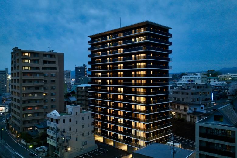 The approach features a waterscape reminiscent of a tributary flowing into the Honmyo River, opening up to the region. At night, the light leaking from the residences illuminates the white horizontal slabs of the balcony, transforming the entire building into a "giant lantern." The beautiful nightscape contributes to the scenic view of the historic district and also enhances the sense of security when returning home.