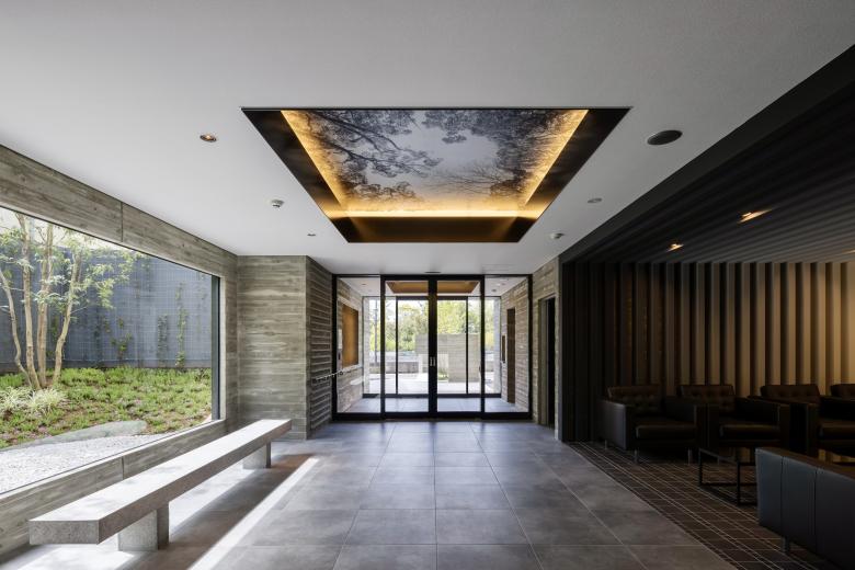On the axis of the lounge, a courtyard planted with cherry trees, moss phlox, maple trees, and white oak allows for the observation of seasonal changes through large glass panels. Minimalist concrete benches are installed as if floating.