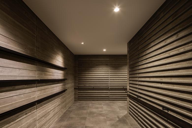 The entrance hall is made up of exposed concrete walls with horizontal ribs, adding shadows that create a museum-like, tranquil, and high-quality atmosphere.
