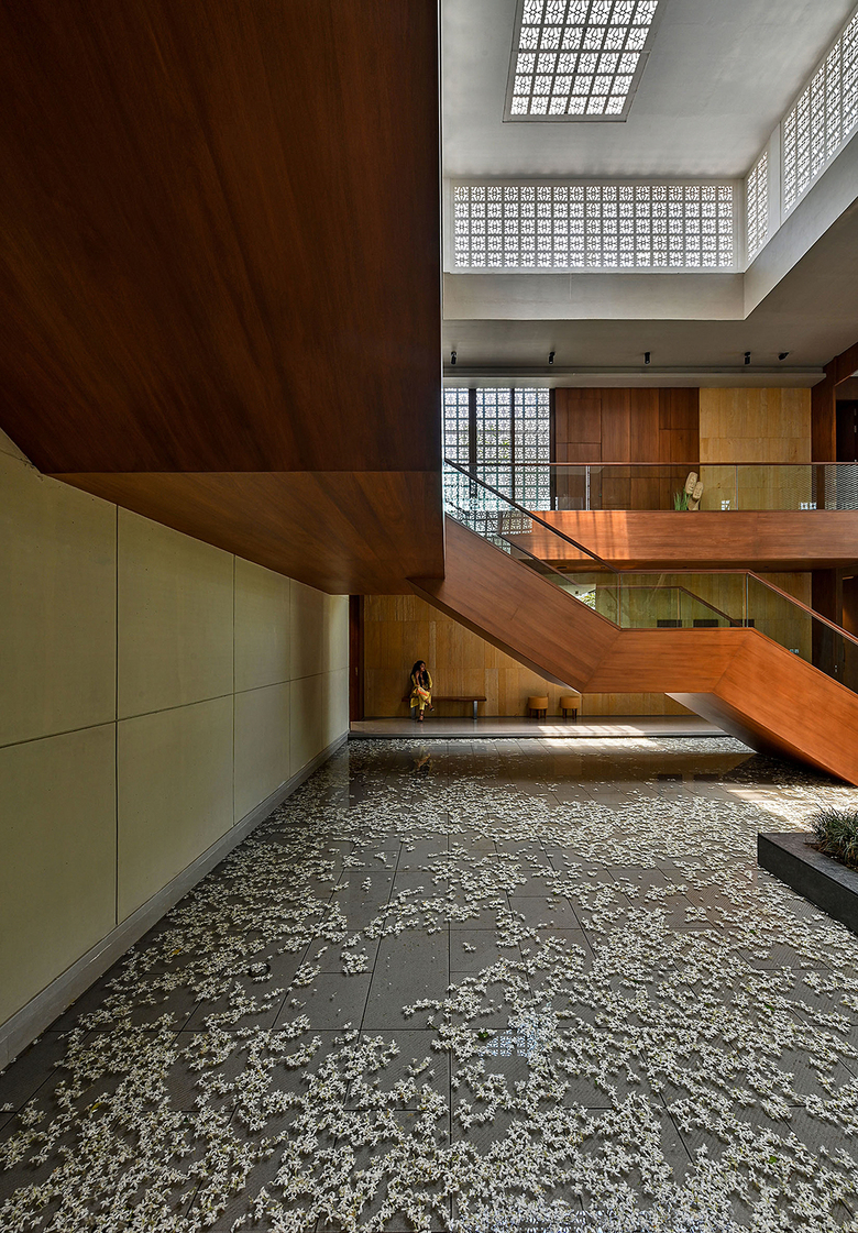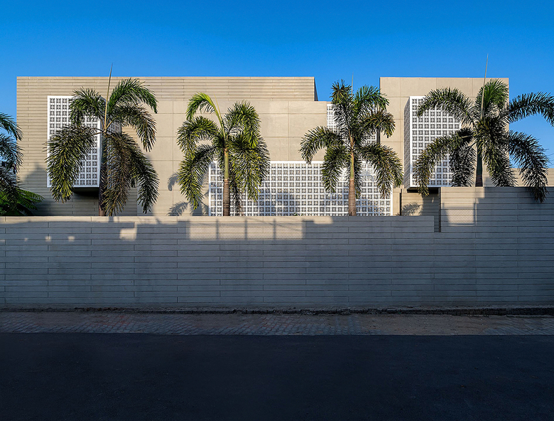 Patterned screens derived from traditional Indian architecture and the famous Lucknow 'chikan' embroidery sheath outdoor seating areas for each room on the south, west and east sides. These screens provide shelter from the sun, create different light patterns throughout the day and mitigate traffic noise from the busy arterial road on the southern side.