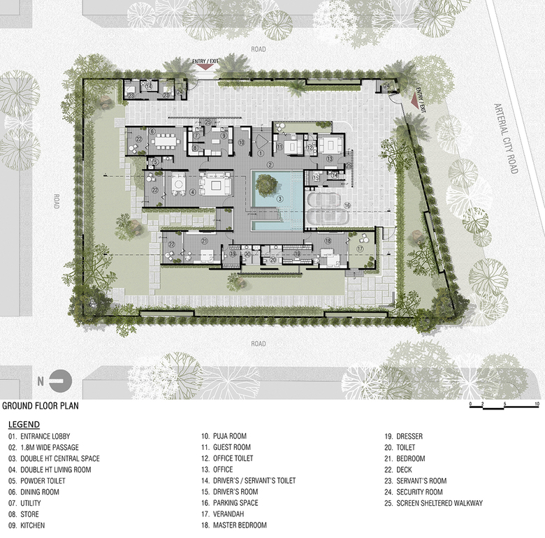 The extensive requirements of the 6 bedroom house are interspersed with sheltered open terraces and landscaped gardens around a 2 floor high naturally ventilated courtyard.