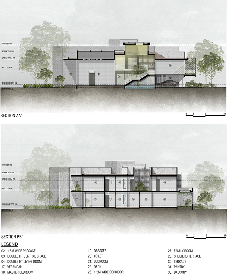 Varying volumetric proportions with differing sectional spaces create an individual identity to each living space with the courtyard cohesively integrating them together.