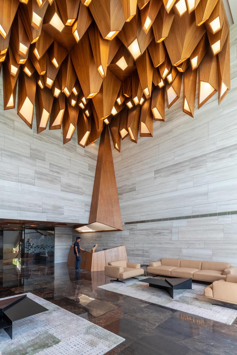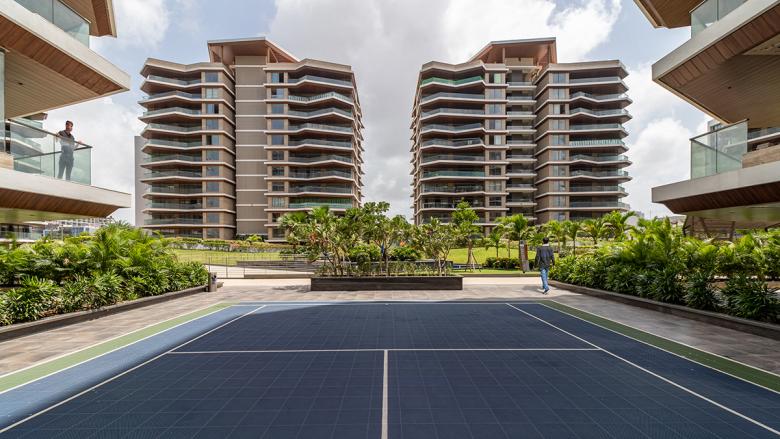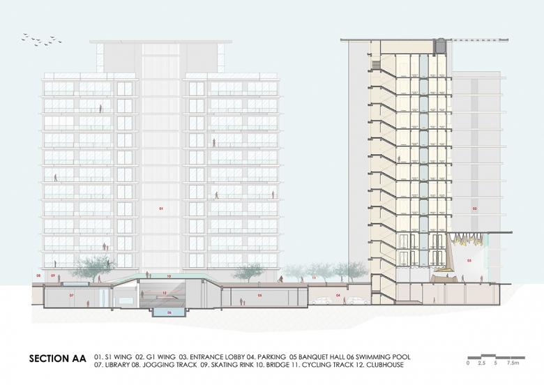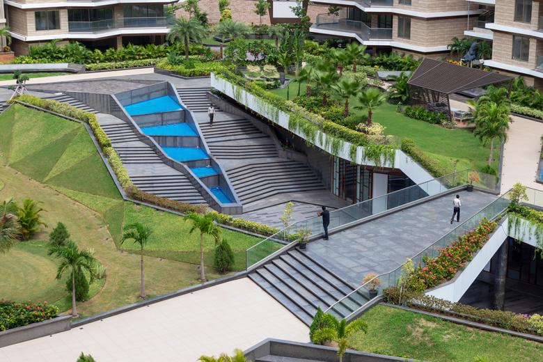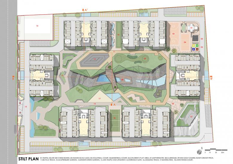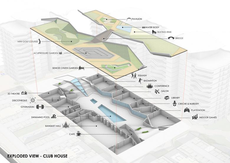 The large landscaped area rises in angular planes revealing a partially sub-terranean recreational club with entertainment & sports facilities that are sheltered from heat gain & simultaneously open to natural ventilation & light.