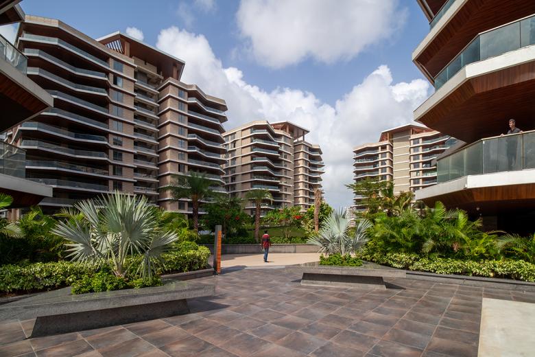 Located on a plot of 29,600 sqm in Surat city, India, with a height limitation of 40 metres, the buildings are laid out along the site perimeter creating a large focal garden of 13,000 sqm.