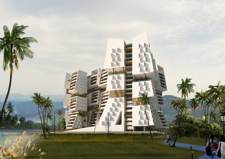 A height of 17 floors and a buildable area of 6 times the plot size are limiting factors on this plot of 12346 sqm in Mauritius touching a river on the northern side. The layout of buildings is done along the southern and western sides of the plot creating a large landscaped garden on the north overlooking the river and hills beyond. Most of the 250 apartments are angled to overlook the garden below and the hills in the distance oriented towards the north to reduce heat gain and capitalize on the natural surrounding views.