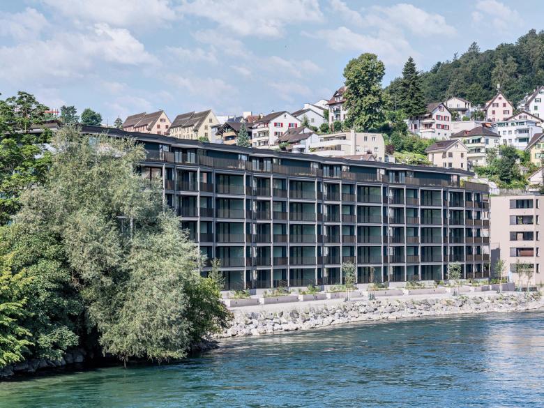 Der Neubau bietet vielfältige Wohntypologien. Dank des Durchwohnprinzips profitieren die meisten Grundrisse sowohl von der urbanen Südseite als auch vom ruhigen Flussraum. Die umlaufende Balkonschicht prägt das Fassadenbild, indem sie auf der Südseite den notwendigen Sonnenschutz gewährleistet und auf der Nordseite mit Blick auf den Fluss private »Belvedere« schafft. Eine filigrane Holzkonstruktion strukturiert die lange Fassade und verstärkt durch ihre wellenartige Bewegung zur Flussseite hin die Verbindung zum umgebenden Landschaftsraum.