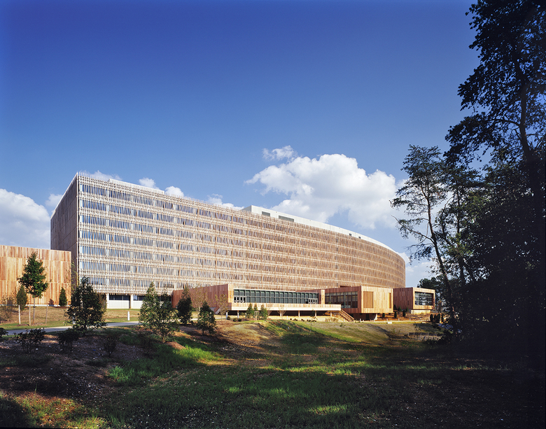Situated on 80 wooded acres of the Suitland Federal Center near downtown Washington, D.C., the 1.5-million-square-foot headquarters for the U.S. Census Bureau houses all of the Bureau’s 6,000 employees. To minimize this necessarily large building’s presence in its natural setting, the design team limited the office program to eight stories and used a variety of other architectural and sustainable design strategies to reduce the real and perceived impact on the site. Two separate buildings grow from one single mass, cleaved apart to create a central garden that integrates the building with its landscape, while maintaining one cohesive vision.
