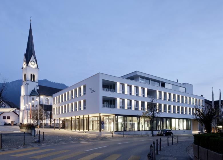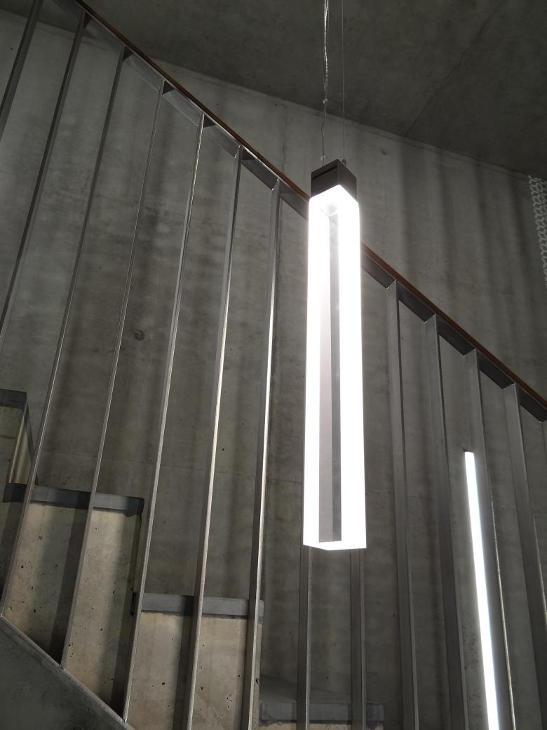 Die Fassade des Gebäudes wird mit den linearen, hinterleuchteten Struktur-Elementen in seiner dominanten Position innerhalb der Gemeinde gut platziert. Die Akzentuierung mit Licht setzt sich über die Treppenhäuser mit gependelten Acryl-Lichtstäben fort, um dann in den öffentlichen Bereichen sehr gleichmässig und beruhigend die Architektursprache zu unterstützen.