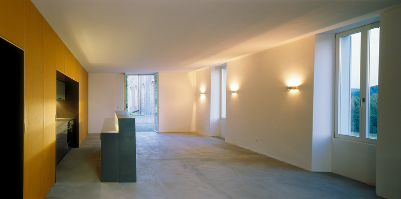 Das Erdgeschoss, ein einzelner Raum von ca. 85 m2, wird durch den grossen Hof mit zwei Aussenbereichen ergänzt. Der eine Aussenbereich liegt angrenzend an die Kirche und dient als eher introvertierter, privater Aussenbereich mit Morgen- und Abendsonne. Der andere Aussenbereich ist dem Dorf zugewandt, gegen Westen hin orientiert und wird als Aussensitzplatz genutzt.