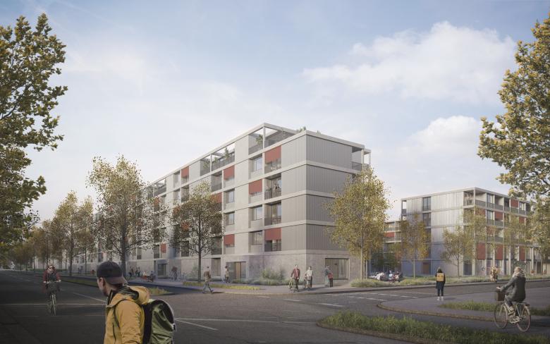 Die Disposition der Gebäude orientiert sich an den städtebaulich-räumlichen Situation mit der Lage an einer lärmexponierten Hauptstrasse. Form Kubatur und strukturelle Ausformulierung der Neubauten unterliegen klaren, typologischen Prinzipien: zwei – dreiseitige Ausrichtung der Wohnungen, Ausbildung von Balkonen zu den privaten und gemeinsamen Aussenräumen, offenen Wohn- Essbereiche mit zuschaltbaren Küchenräumen und Individualzimmern . Diese Regeln eröffnen im Grundriss folglich eine enorme Vielfalt und Variabilität von Gebäudetiefen, die sich wiederum charakterbildend im Volumen abzeichnen.