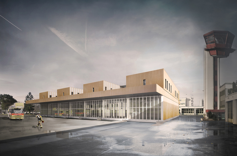 Was wäre der Flughafen Zürich ohne eine Feuerwehr? Das Gebäude dazu ist pragmatisch. Eine Ebene Handwerk, eine Ebene Fahrzeuge, eine Ebene Wohnen. Unten die Arbeit, oben das Vergnügen und die Erholung. Alles ist praktisch, robust, strapazierbar, ökonomisch, clever. Abgestimmt auf die Bedürfnisse. Der rechteckige Körper wird seitlich aufgeklappt, genannt Vordach. Dazu wird er ausgeschnitten, damit es Luft zwischen den Ruhe- und Schlafräumen gibt. Materialien und Farben unterstützen Organisation, Atmosphäre und verbinden die Ebenen.