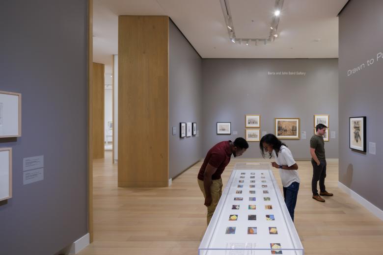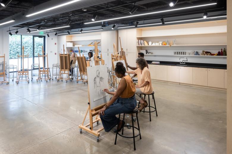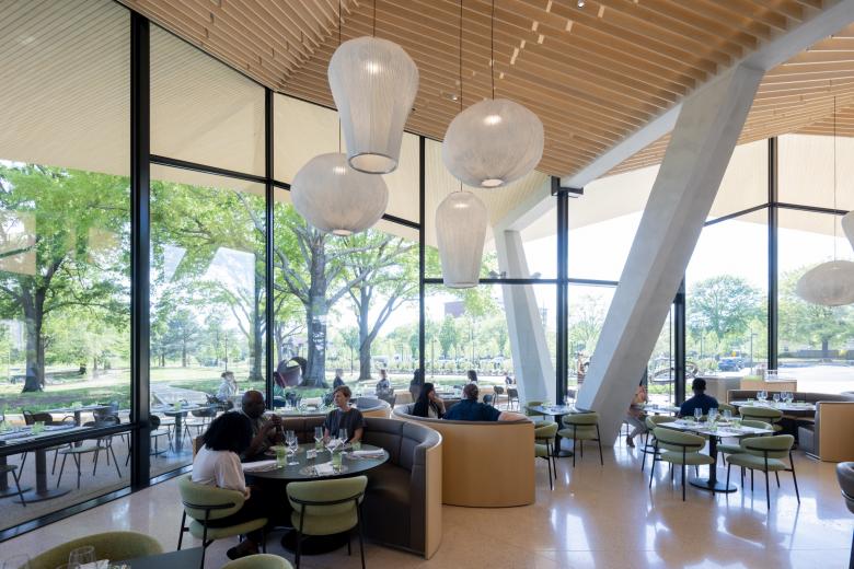 At each end, the central stem appears to blossom outward, opening the museum to its surroundings and welcoming the public in. To the north is the Cultural Living Room, a hovering, transparent volume that serves as a community gathering space and as a beacon that welcomes visitors to AMFA. To the south, the deep overhangs of the roof create a sheltered dining terrace for the new indoor-outdoor restaurant that steps down to meet MacArthur Park.