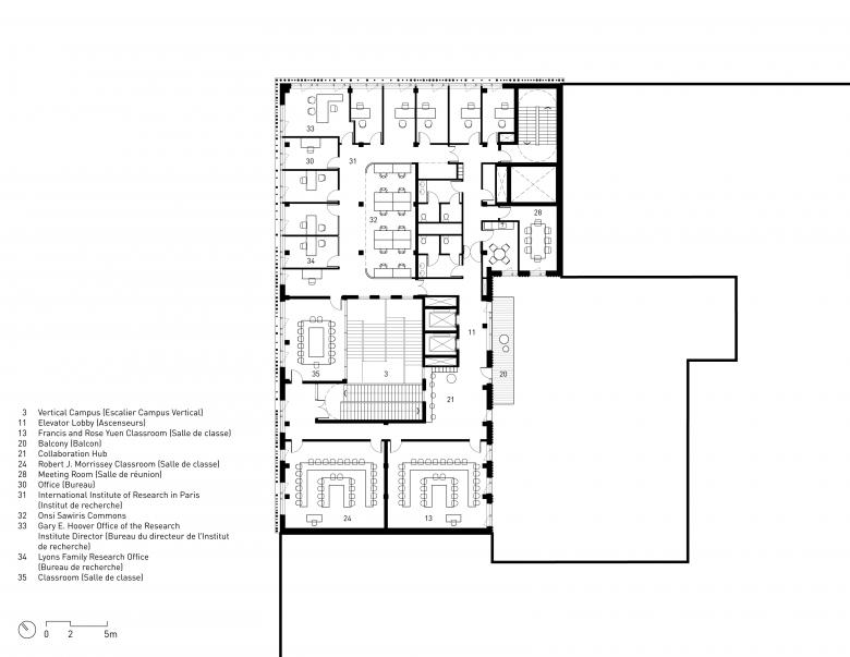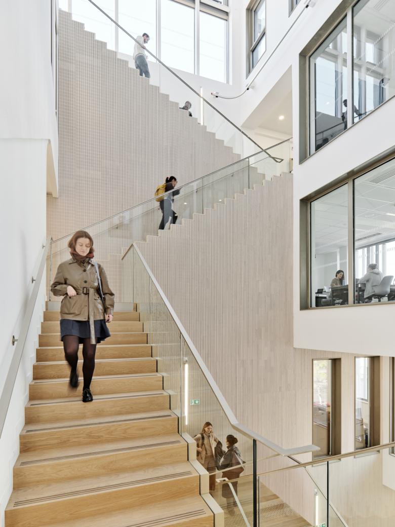 Beyond its walls, the building promotes a lively exchange between Parisians and University students and faculty by connecting transit users to a regional train station directly below and activating the streetscape with a newly commissioned artwork by Tony Lewis.