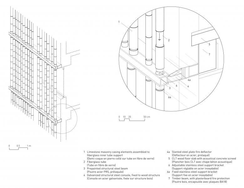 The building’s defining feature is a brise soleil façade composed of approximately 900 cylindrical batons. The stone batons function as a filtering screen whose porosity responds to the program within, densifying around private spaces for study and research and opening to reveal activity in public and event spaces. Each baton is enrobed in Lutetian limestone, a stone that underlies much of the Paris region and has been a common local building material since antiquity. Limestone links the building to the University’s main campus in Chicago, where it is also a prominent building material, while simultaneously rooting it to the history of Paris.