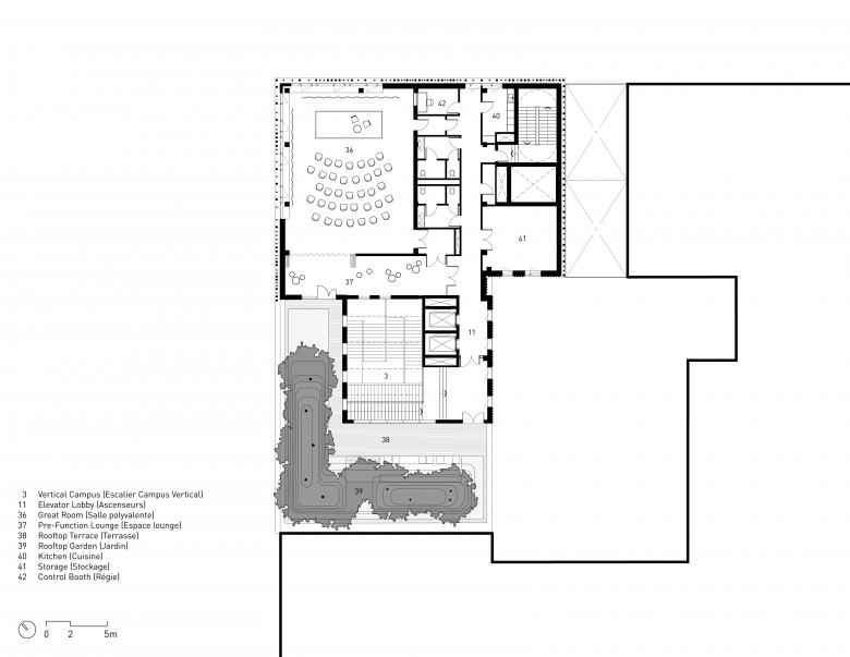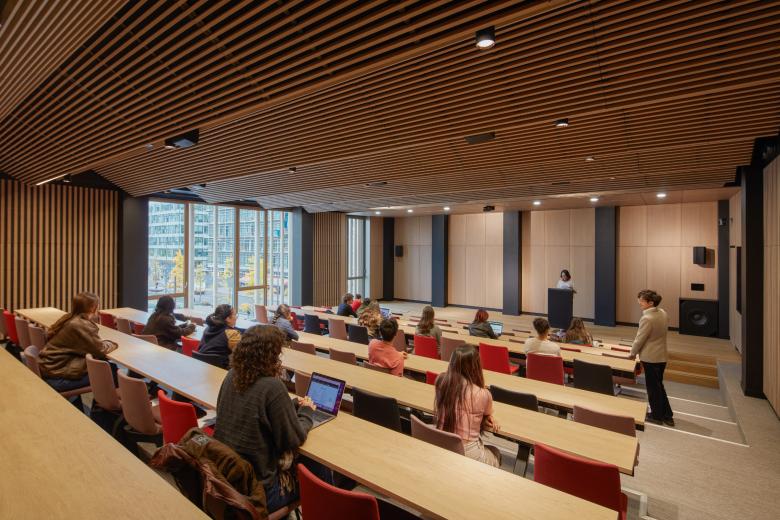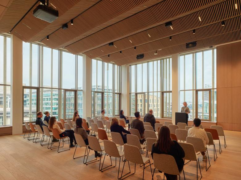 On the top floor, a double-height event space with an adjoining biodiverse rooftop garden supports the Center’s role as a forum for intellectual exchange by bringing an airy atmosphere and sweeping views of the city to conferences, cultural events, and social gatherings. An amphitheater can similarly be configured to accommodate lectures, conferences, or large classes.