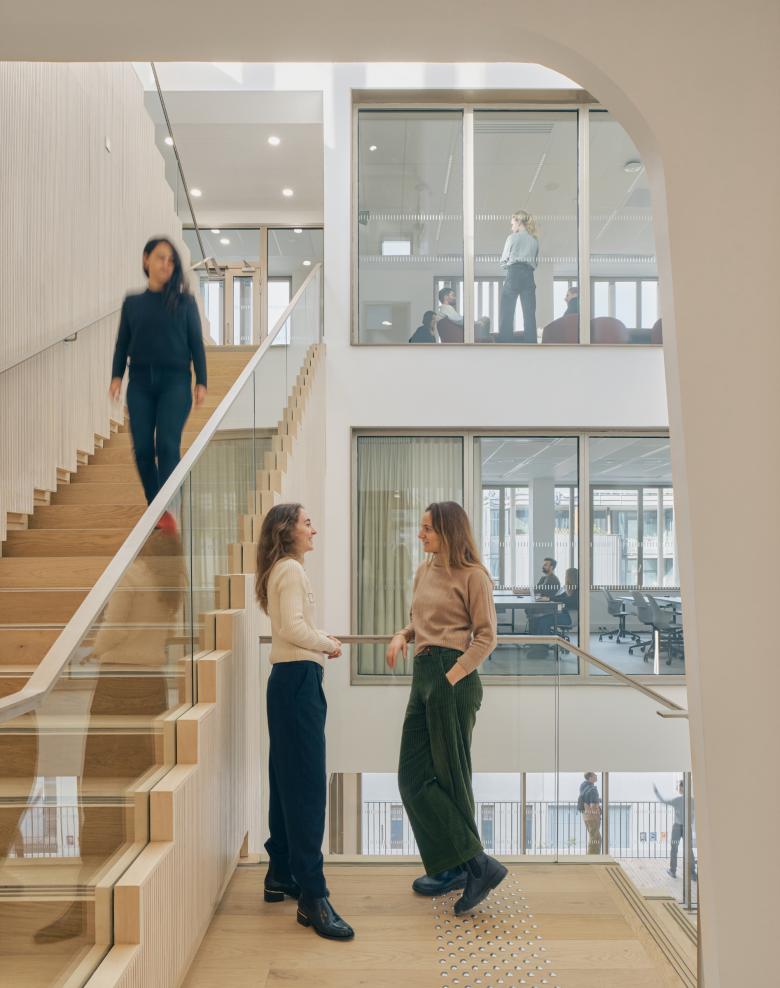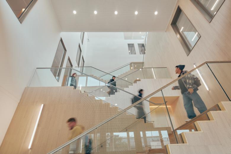 The 25,460 sf (2,365 sqm) building is designed as a vertical campus, with learning and research areas wrapping around a central atrium that connects spaces both physically and visually. Outdoor spaces—including a shared courtyard, a loggia, and a series of terraces—provide places for socializing, study, and rest as well as access to nature and a habitat for urban wildlife. Nine classrooms, including a laboratory teaching space, support academic activities, while a research institute provides a home base for visiting academics.