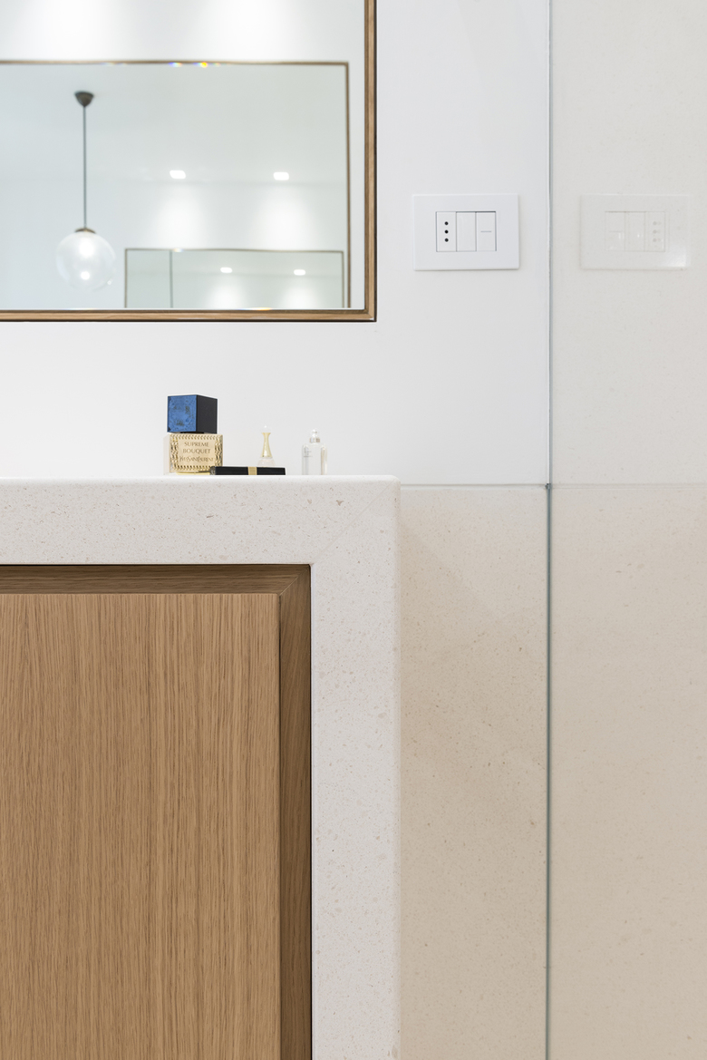 L’ingresso è un tappeto che accoglie il visitatore nel baricentro geometrico dell’intero appartamento. Ne riflette la simmetria dei percorsi che lo attraversano, di cui costituisce il crocevia.