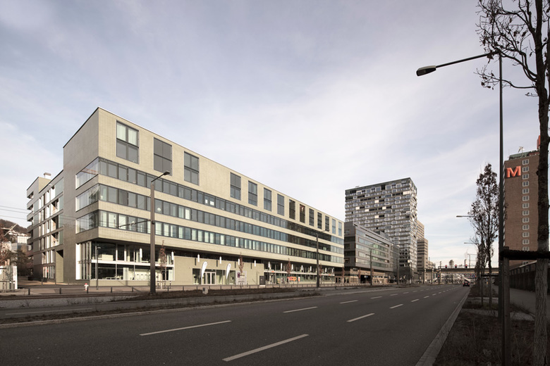 An der Pfingstweidstrasse in Zürich-West entstand als Teil des Gesamtentwicklungsprojektes Hard Turm Park ein Wohn- und Dienstleistungsgebäude. Das Volumen bildet dabei einen städtischen Block mit Innenhof.