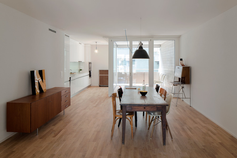 Der Südflügel entlang der Pfingstweidstrasse markiert Präsenz an der wichtigen Stadteinfallsachse. Die dort untergebrachten Duplexwohnungen überzeugen durch eine grandiose Weitsicht bis zum Uetliberg, sind über einen Laubengang erschlossen und bieten dank privatem Atrium ein hohes Mass an Intimsphäre.